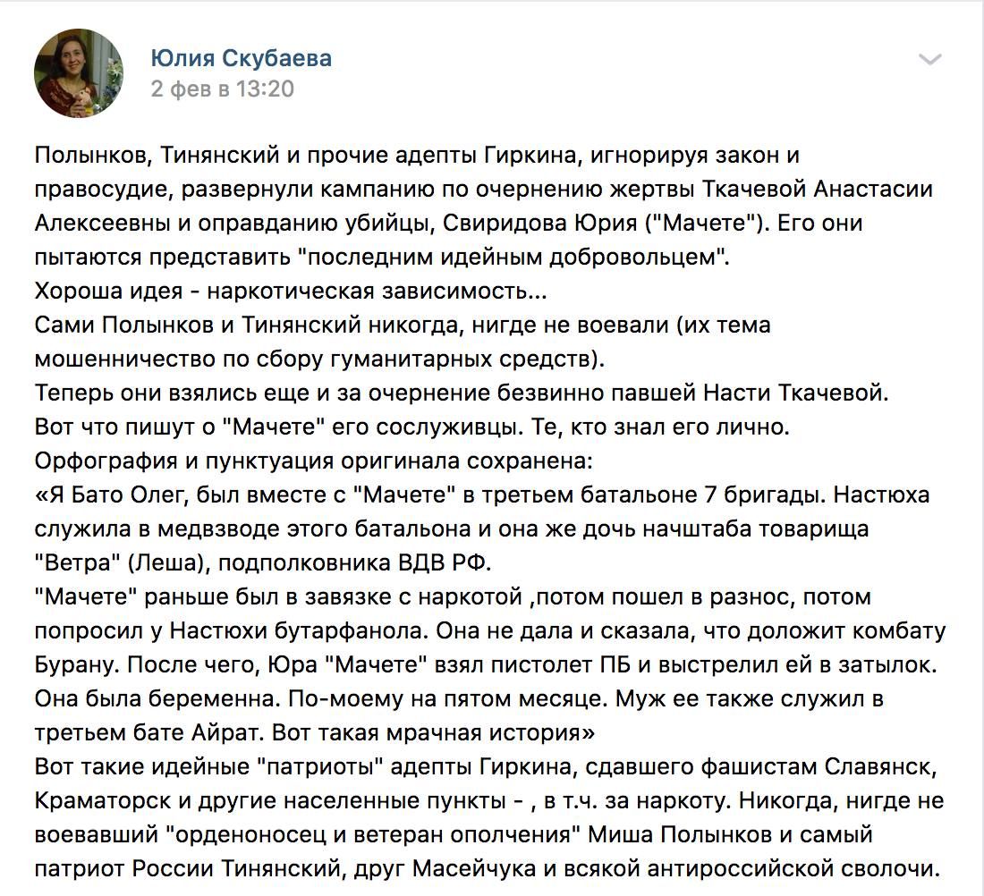 Одна з пропагандисток Юлія Скубаєва повідомляла, що також Свиридов був наркозалежним.