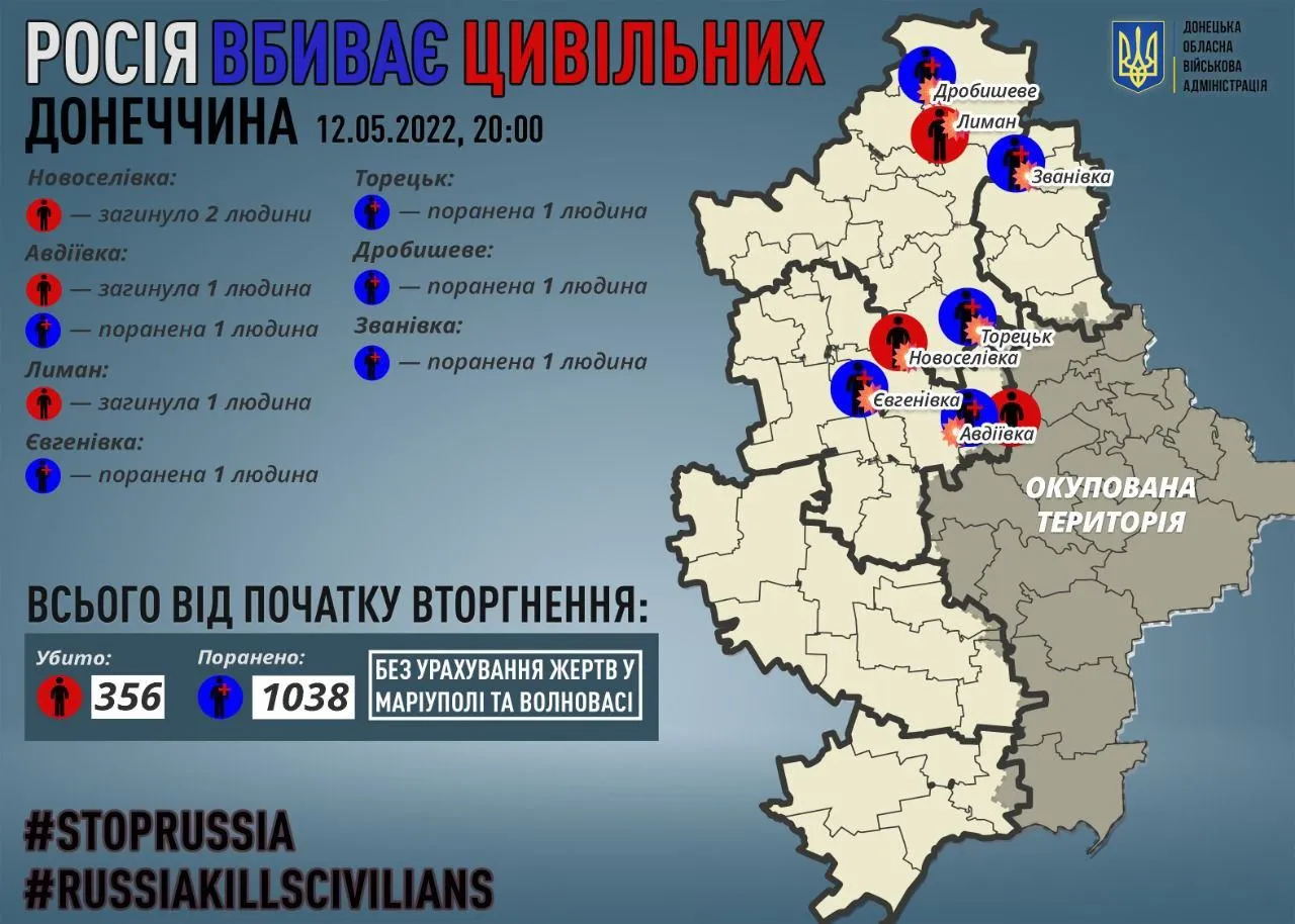 За 12 травня військовослужбовці російської армії вбили 2 людей у Новоселівці, 1 – в Авдіївці та 1 – у Лимані. Зазначається, що ще 5 осіб отримали поранення.