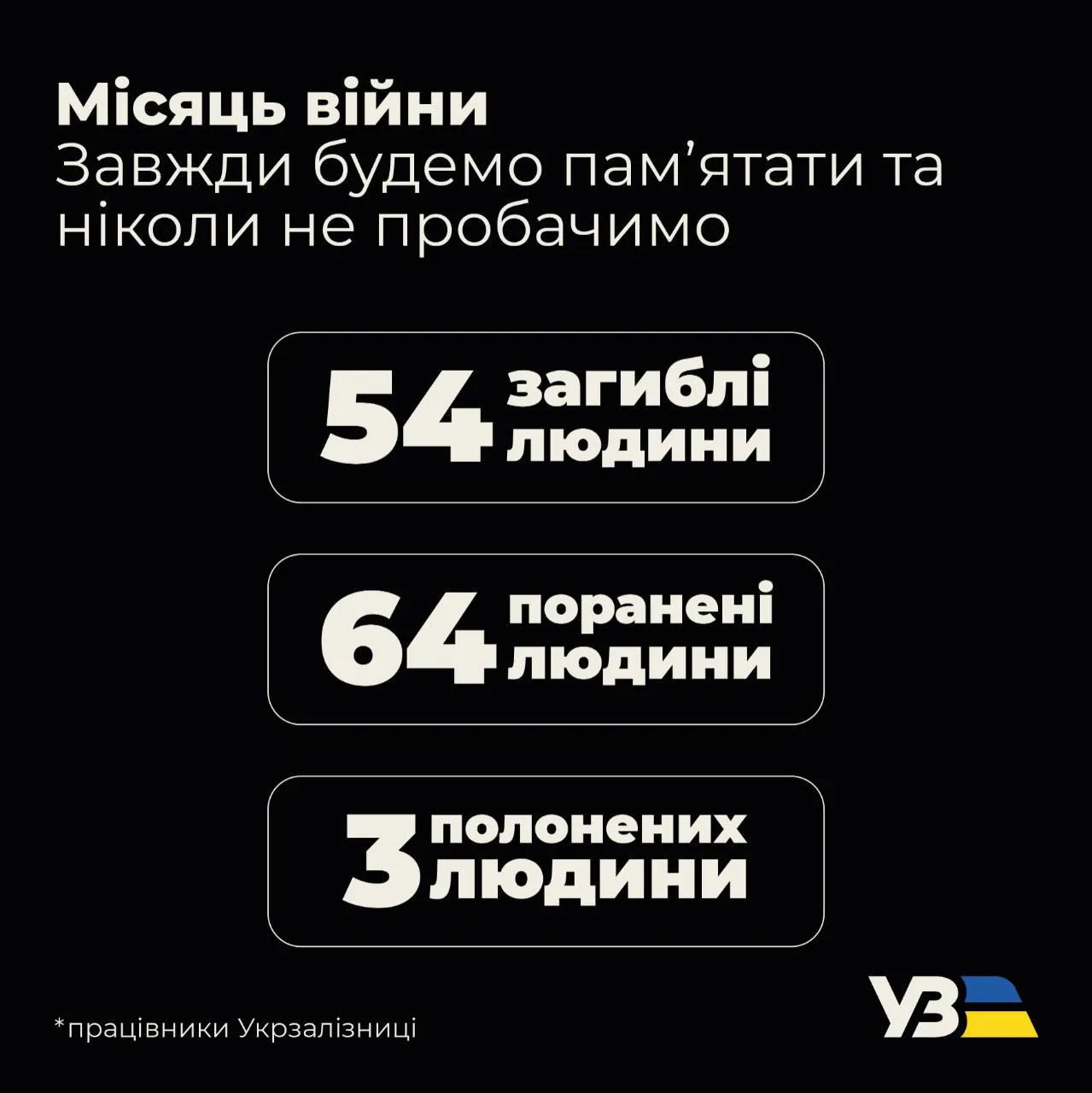 Перший місяць війни забрав життя 54 залізничників, 64 залізничники поранені, з різним ступенем тяжкості. І це найважча для мене сторона війни,