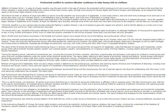 "З середини квітня по 6 жовтня щонайменше 3660 осіб було вбито і 8756 поранено на сході України. <...> З початку припинення вогню, в період з 6 вересня по 6 жовтня зафіксовано 331 летальний випадок, хоча деякі з цих осіб, можливо, були вбиті до припинення вогню", — зазначається в документі.