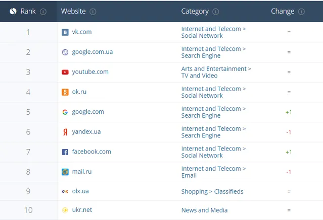 "Однокласники" втратили цілих 17,62% українського трафіку, а пошта Mail.Ru просіла на 16,20%.