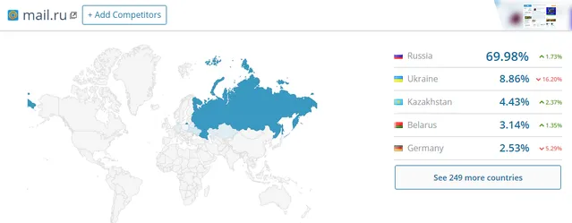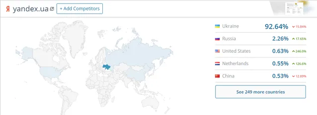 Пошуковик "Яндекс" українські інтернет-юзери досі використовують, проте загалом трафік цього ресурсу впав на 12,24%, а кількість відвідувань з України зменшилась на 15,84%. натомість кількість відвідувань зі США збільшилися аж на 246%, а з Нідерландів – на 126,6%.