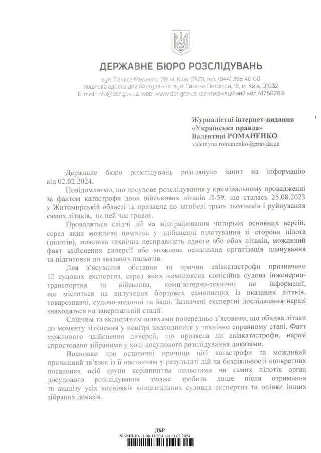 У відповіді на запит журналістів у ДБР повідомили, що розслідування у кримінальному провадженні за фактом катастрофи двох військових літаків Л-39 у Житомирській області ще триває.