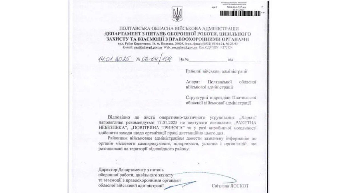 Згідно з інформацією кременчуцьких ЗМІ, у зв'язку з високою загрозою обстрілів, на 17 січня заплановано переведення шкіл Полтавщини на дистанційний режим. Ці заходи впроваджуються через ймовірність російських обстрілів, що ставить під загрозу безпеку учнів і педагогічного складу.