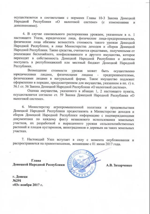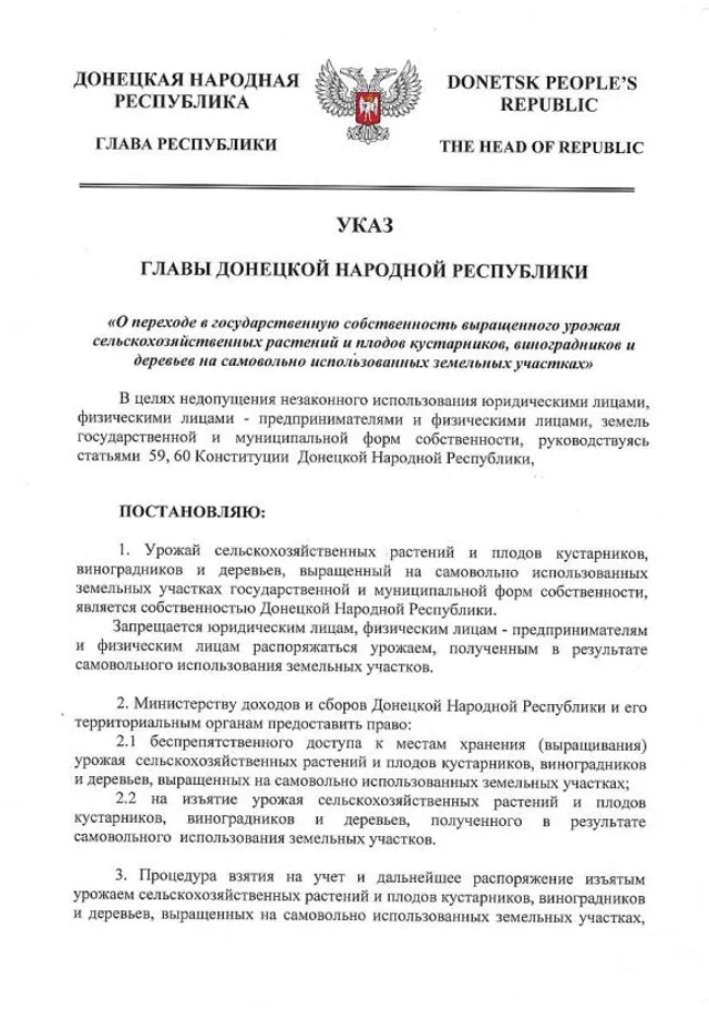 "Урожай сільськогосподарських рослин і плодових кущів, виноградників і дерев, вирощений на самовільно використаних земельних ділянках державної та муніципальної форм власності, є власністю "ДНР"", – йдеться в "указі".