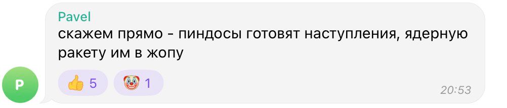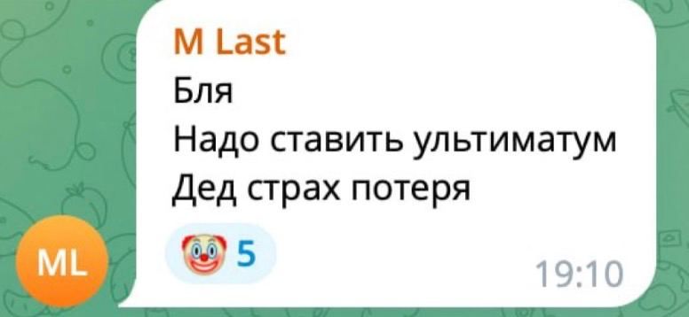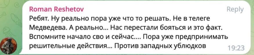 - "Друзі, час вже щось вирішувати. Не в телеграмі Мєдвєдєва, а реально. Нас перестали боятися і це факт. Час уже ухвалювати рішення";