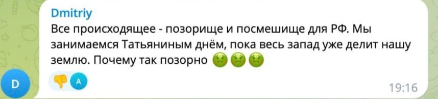- "Усе, що відбувається, соромно та принизливо для Росії. Увесь Захід ділить нашу землю. Чому це так соромно";