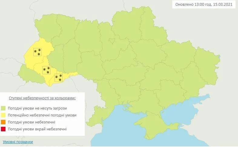 16 березня в Карпатах очікують значний сніг. Вдень пориви вітру сягатимуть 15 – 20 метрів за секунду. Через це там оголосили I рівень небезпечності – жовтий.