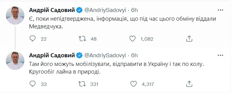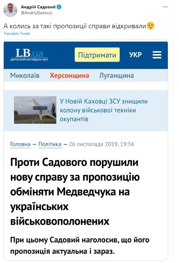 Чи не найбільшу кількість перлів видав мер Львова Андрій Садовий. Він висміяв той факт, що тепер у росії його можуть мобілізувати, після цього кум путіна знов потрапить у полон, що дасть змогу його обміняти.