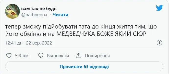 Як відомо, ввечері 21 вересня Україна повернула з полону 215 наших захисників. Їх обміняли на 55 окупантів та зрадників. Серед них – кум путіна віктор медведчук. Ну що ж, як влучно підмітив журналіст Юрій Бутусов, вперше в історії України кумівство врятувало життя людей.