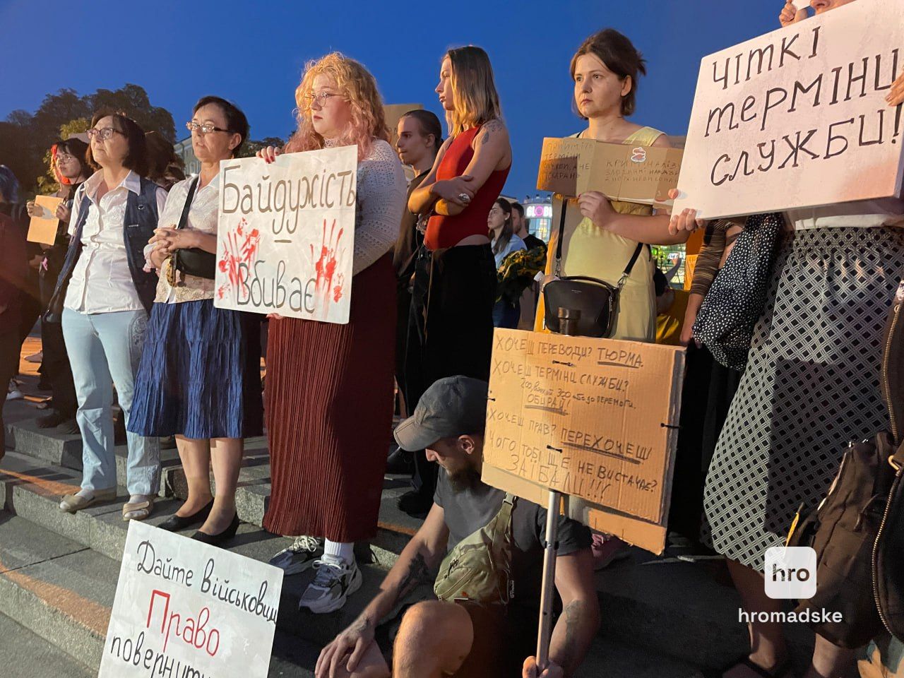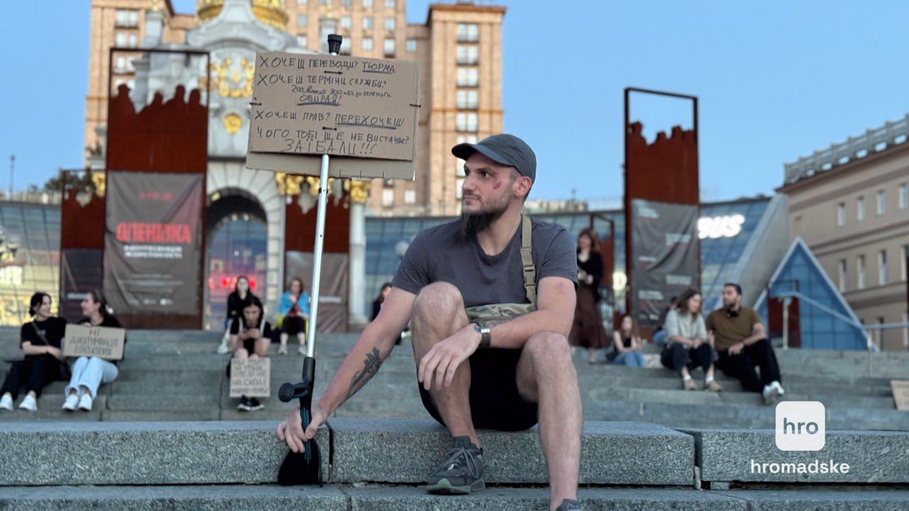 Як пише hromadske, ветеран з бригади "Азов" на ім'я Дмитро сказав, що напис на плакатах мітингувальників "Дайте військовим право повернутися додому" звучить як заклик розпустити армію. Він додав, що якщо військові отримають право йти з передової, то фронт впаде. Однак проти встановлення чітких термінів служби воїн нічого не має.