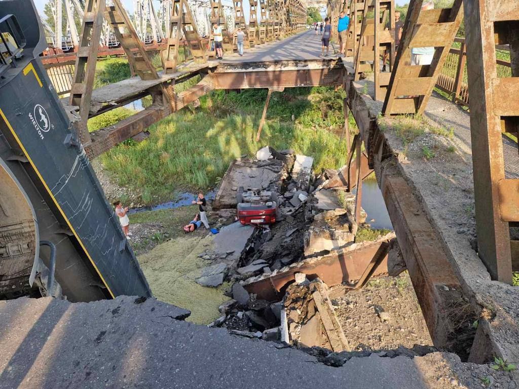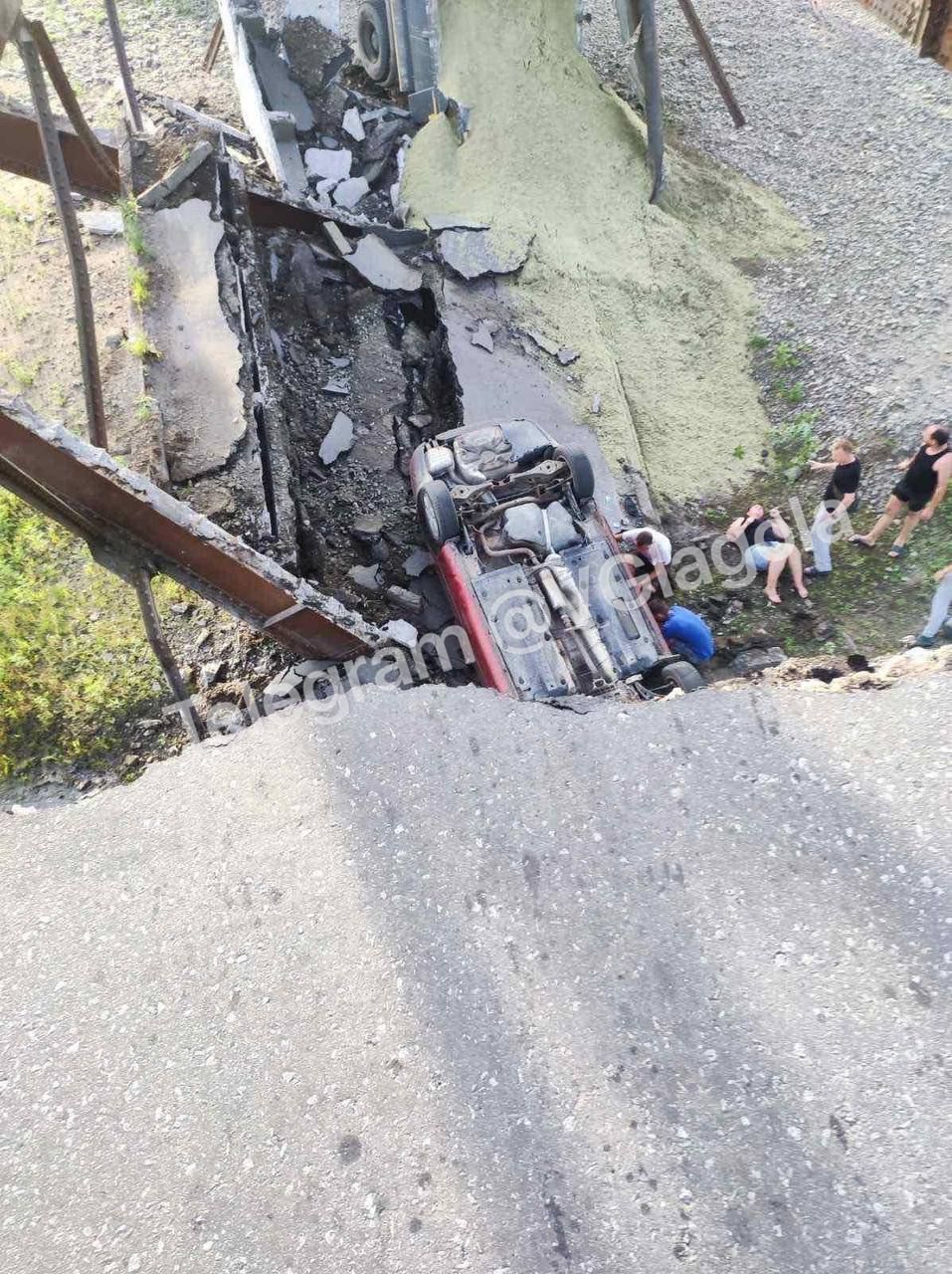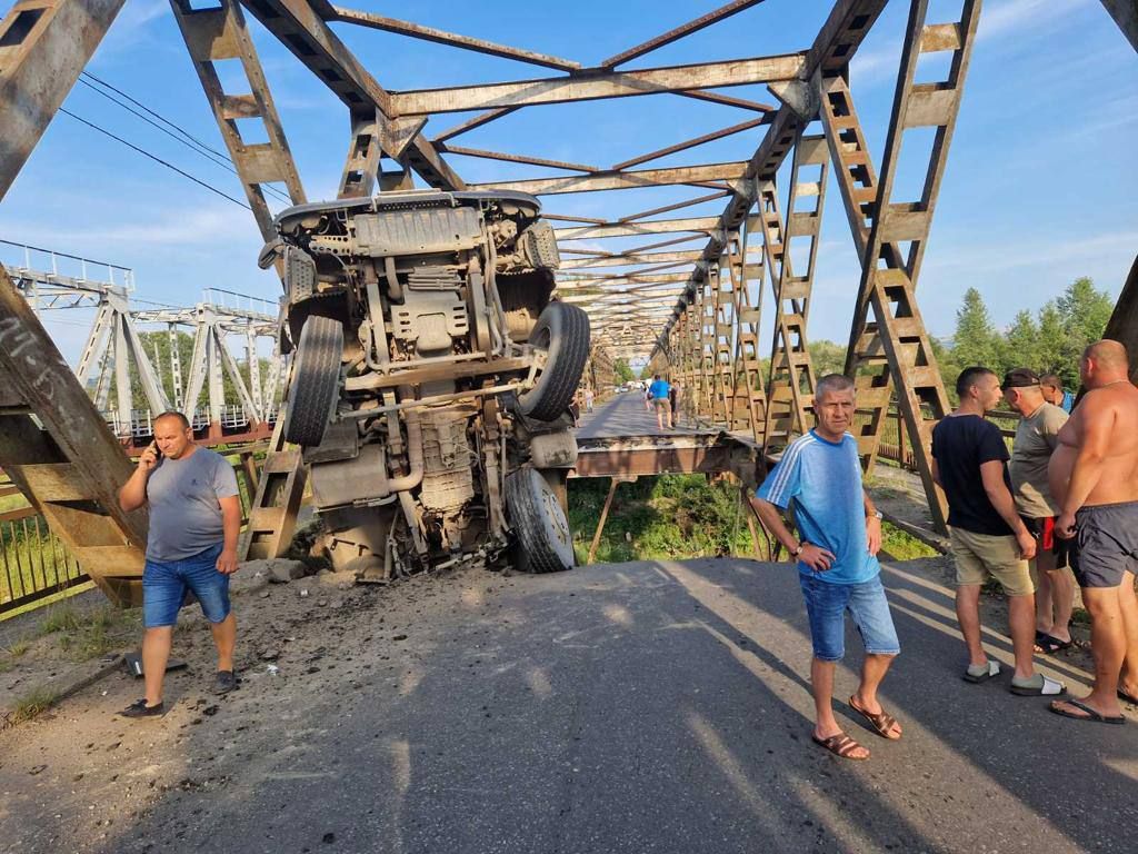 Власне, на світлинах видно, зокрема, вантажівку, що провалилася через руйнування переправи. Окрім того, там можна помітити чимало людей.