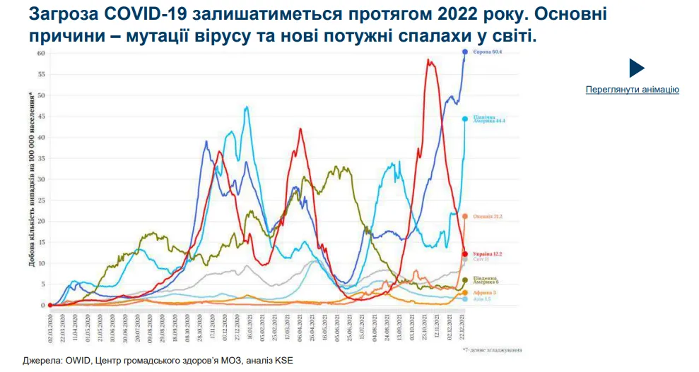 Експерти впевнені, що коронавірус у 2022 році нікуди не зникне, а продовжить мутувати. Так, аналіз Київської школи економіки також демонструє більшу протяжність та потужність осінньої Дельта-хвилі за весняну.