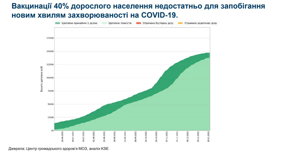 За 2021 рік трошки менше ніж 15 мільйонів українців отримали щеплення принаймні однією дозою. І менше ніж 14 мільйонів осіб пройшли повний курс вакцинації. Станом на 31 грудня 2021 року 44% дорослого населення повністю були вакциновані в Україні,
