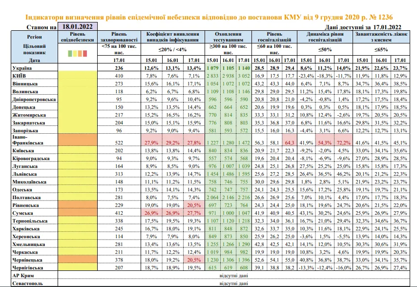За даними МОЗ, станом на 18 січня 2022 року 4 області відповідають "помаранчевій" зоні: