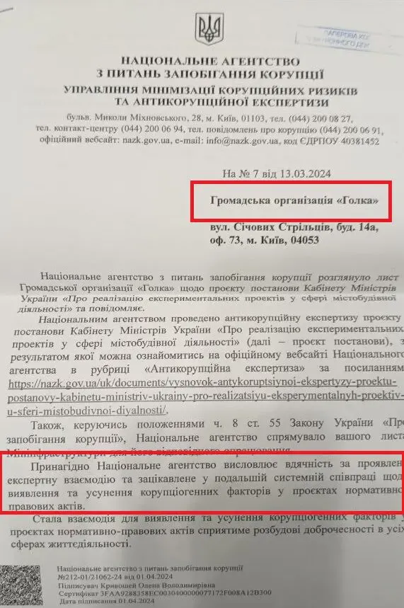 Відповідь НАЗК на надіслані зауваження / фото "Голка"