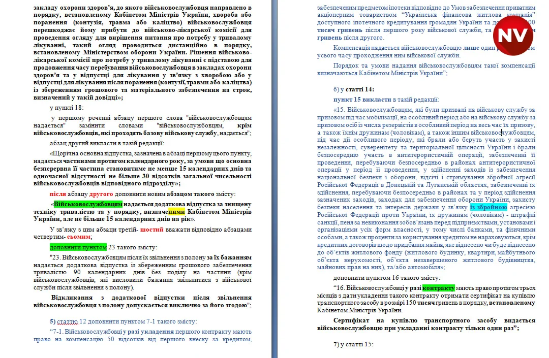 - Соціальний захист. Військовослужбовці отримають додаткові винагороди та соціальні гарантії. Скажімо, відпустка становитиме не менше 15 календарних днів, а розмір одноразової грошової допомоги в разі загибелі військовослужбовця встановлюється на рівні 15 мільйонів гривень.