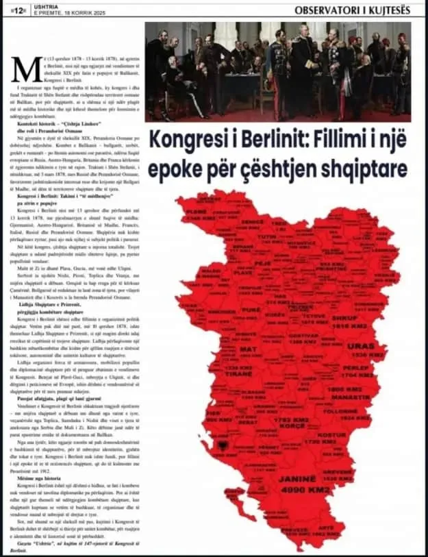 Gazeta Ushtria з нагоди 147-ї річниці Берлінського конгресу опублікувала карту, де Корфу, Превеза, Ігумениця, Нарди, Йоаніна та Гревена позначені як "історичні албанські території".