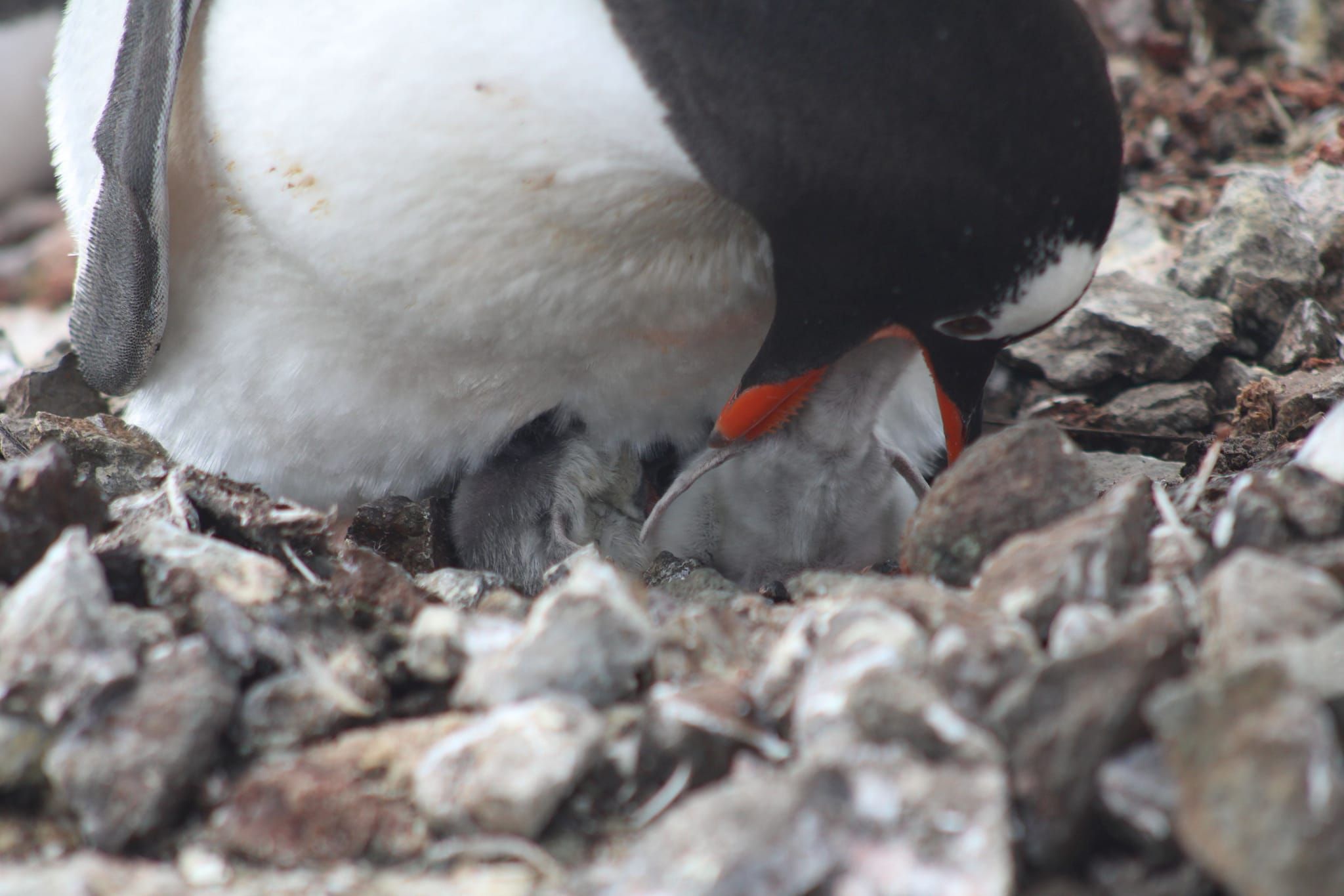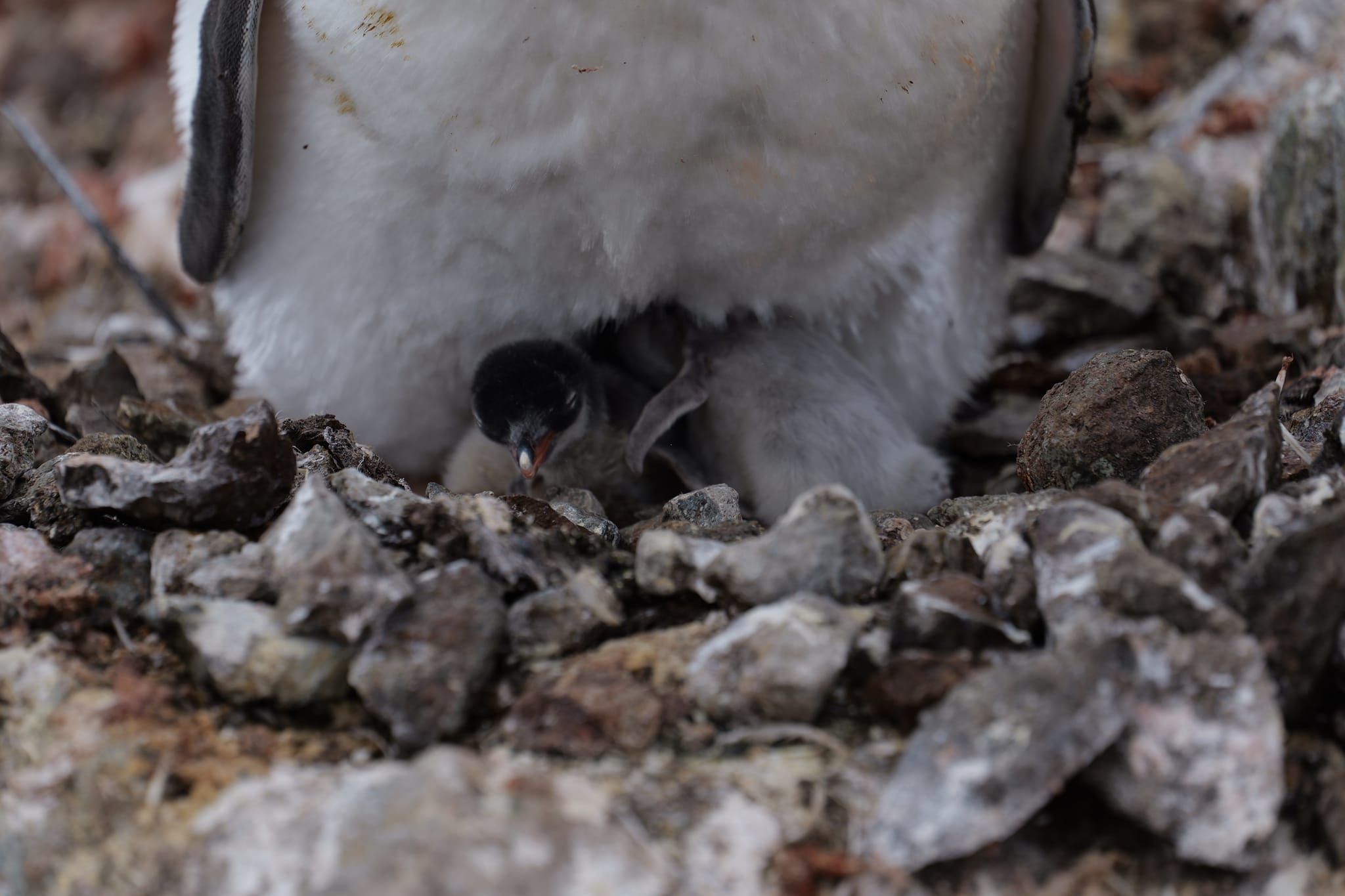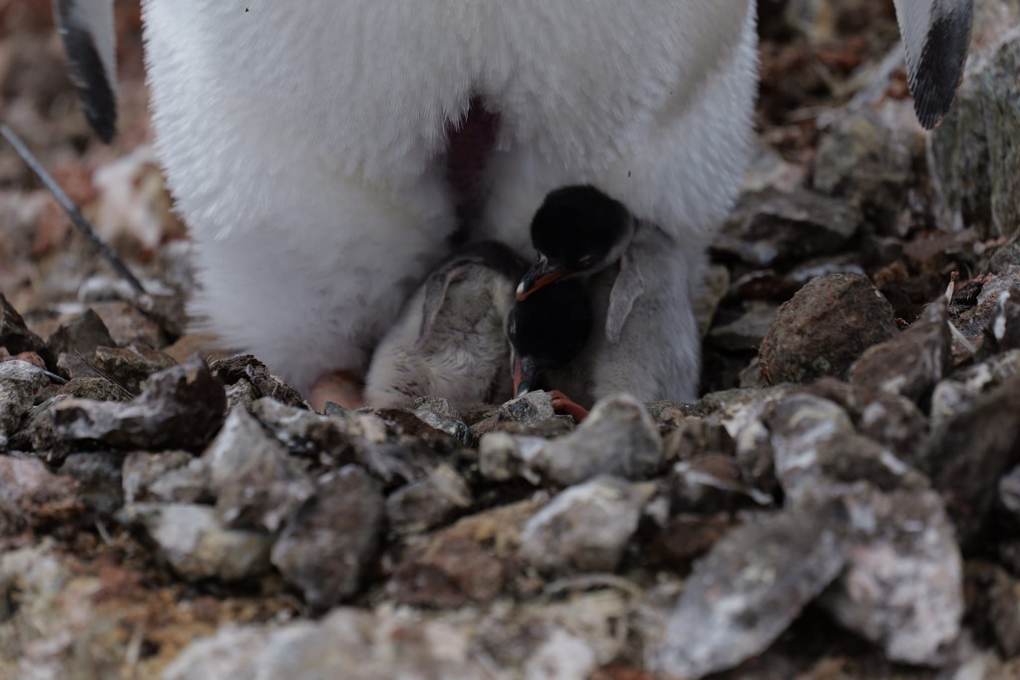 Первый детеныш уже активен – кормится, пищит, поэтому ему где-то полсуток. А второй, видимо, вылупился прямо перед моим приходом, потому что он еще в кусках скорлупы и прячется под взрослого пингвина,