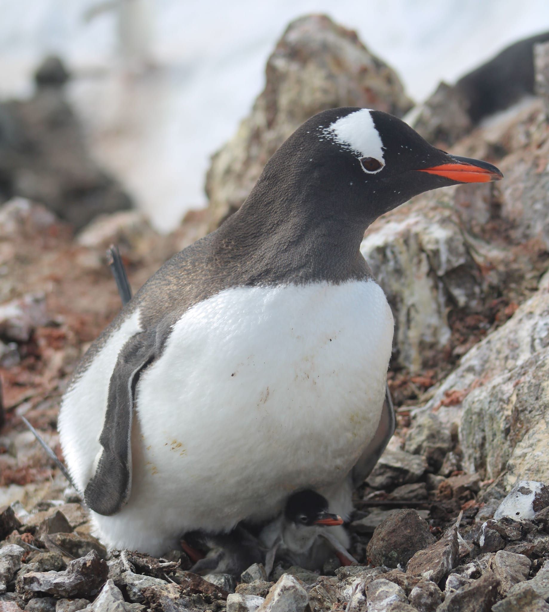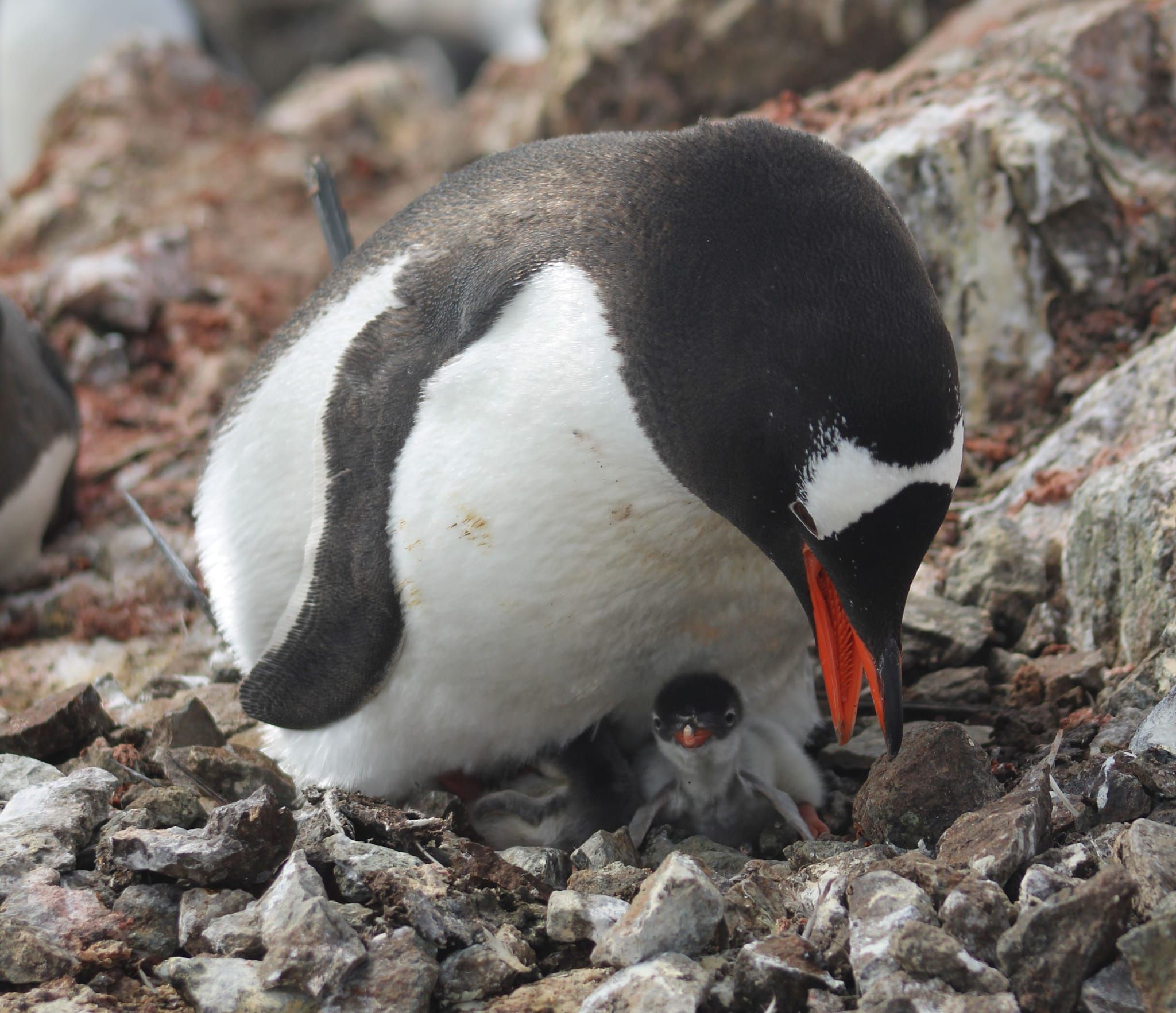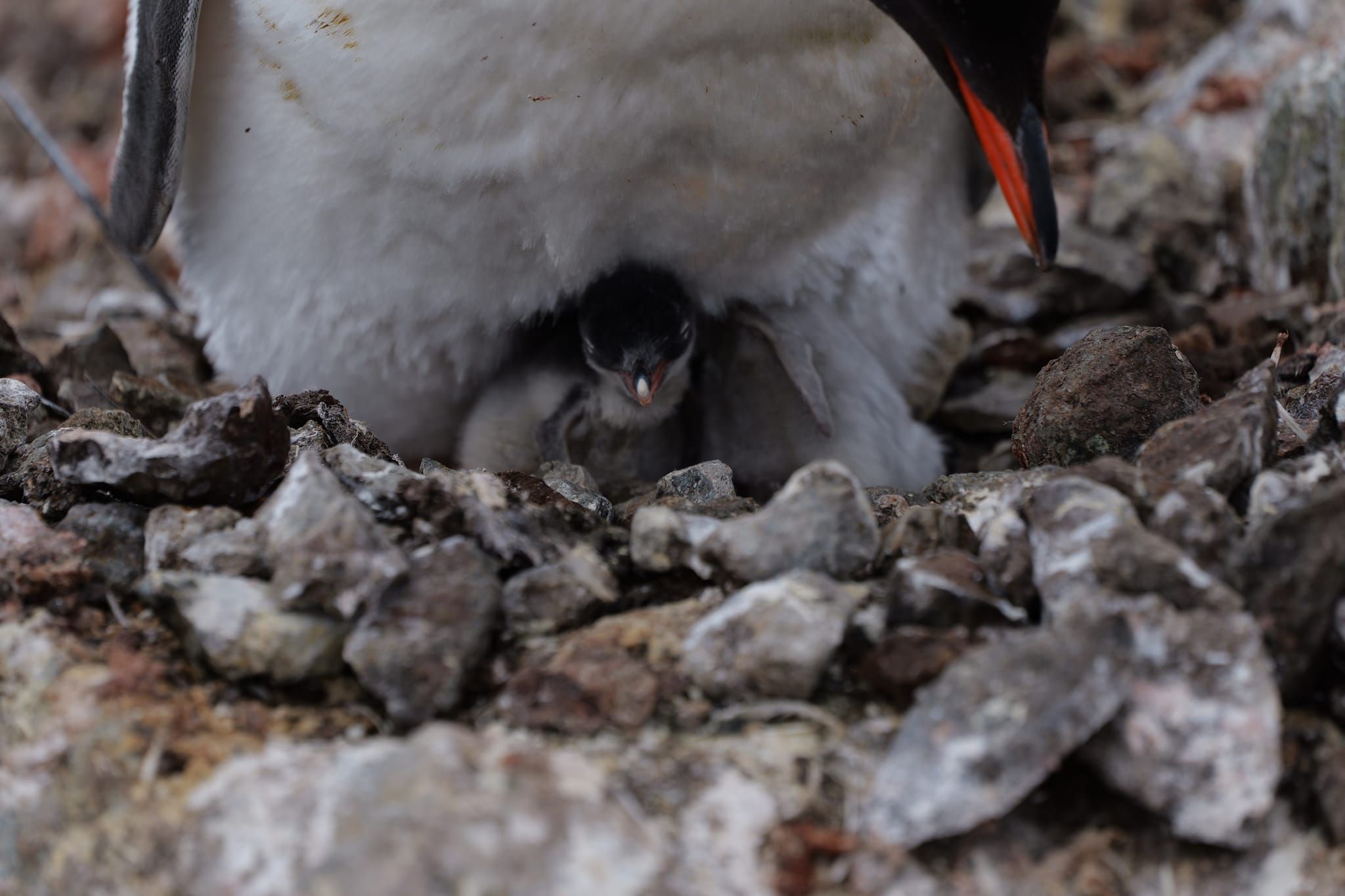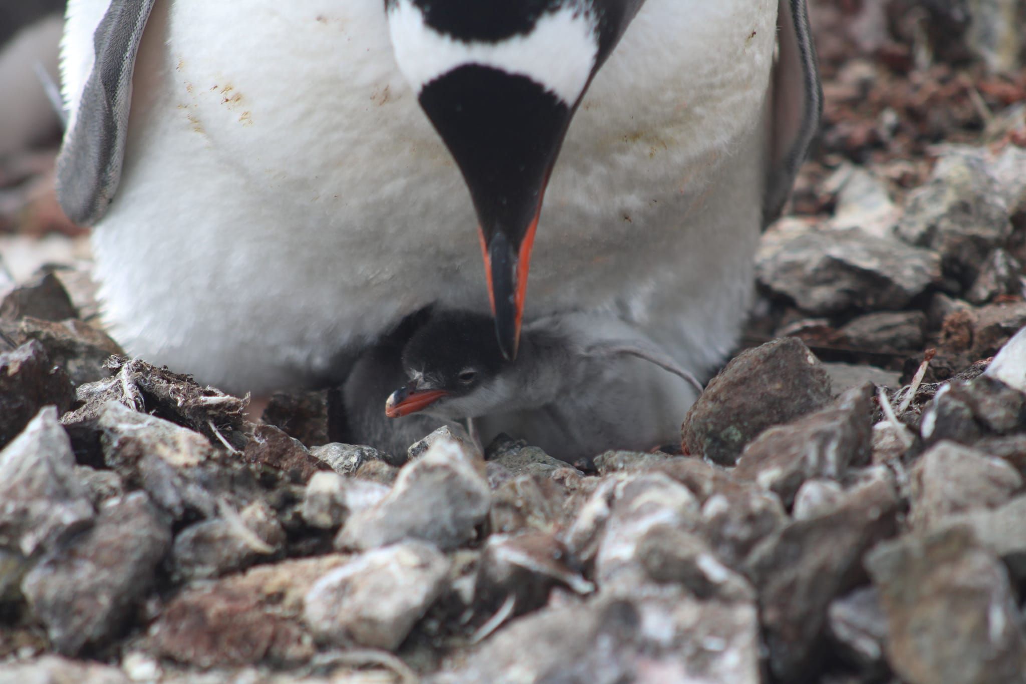 Первый детеныш уже активен – кормится, пищит, поэтому ему где-то полсуток. А второй, видимо, вылупился прямо перед моим приходом, потому что он еще в кусках скорлупы и прячется под взрослого пингвина,