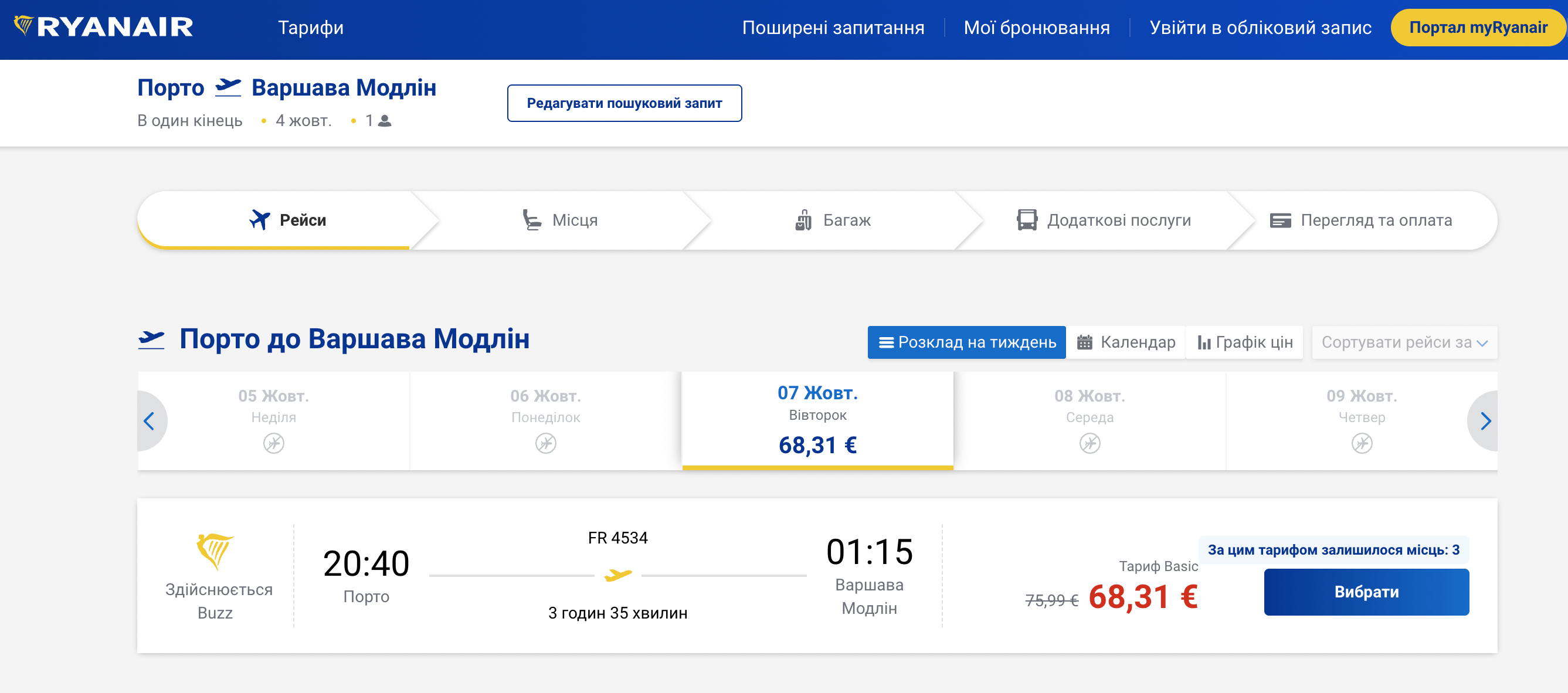 Ціни залежать від дати польотів, наприклад, вартість квитка за напрямком Порту – Варшава на 7 жовтня 2025 року – 69 євро. Переглянути прайс на інші рейси можна на офіційному сайті Ryanair.