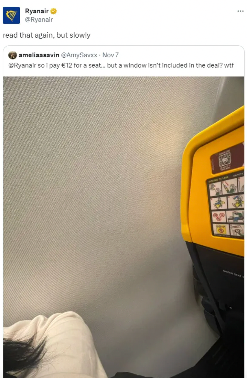 Обурення пасажира, який отримав місце без вікна, та відповідь Ryanair / Скриншот з Twitter