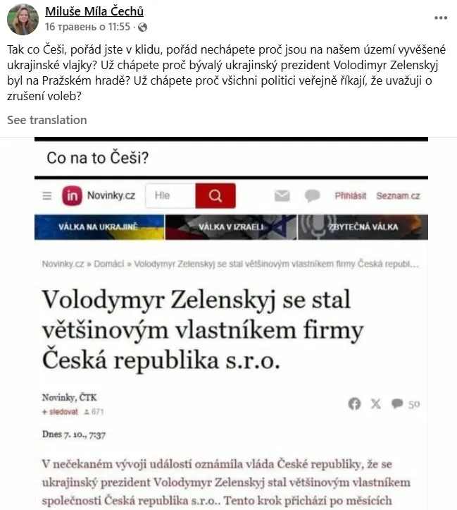 Дезінформаційний допис у фейсбуці почала поширювати певна Мілуше Міла Чеху. Мовляв, "в межах економічної реформи" чеський уряд нібито передав контроль над країною президенту України, щоб "стабілізувати економіку" і "повернутися до золотих часів промислового розвитку".