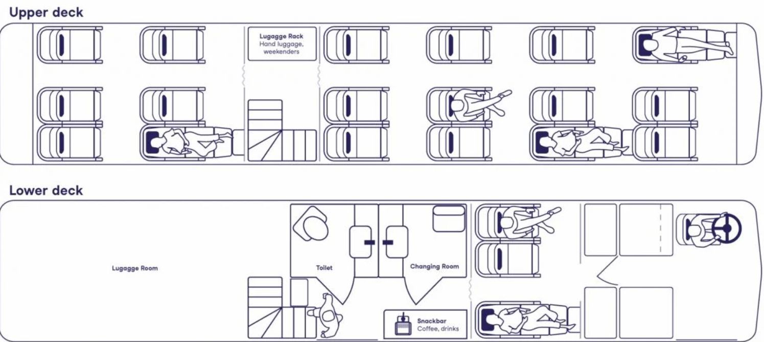 - Автобуси мають 2 поверхи, вміщують до 21 пасажира, оснащені туалетами, розетками, Wi-Fi та місцями для переодягання.