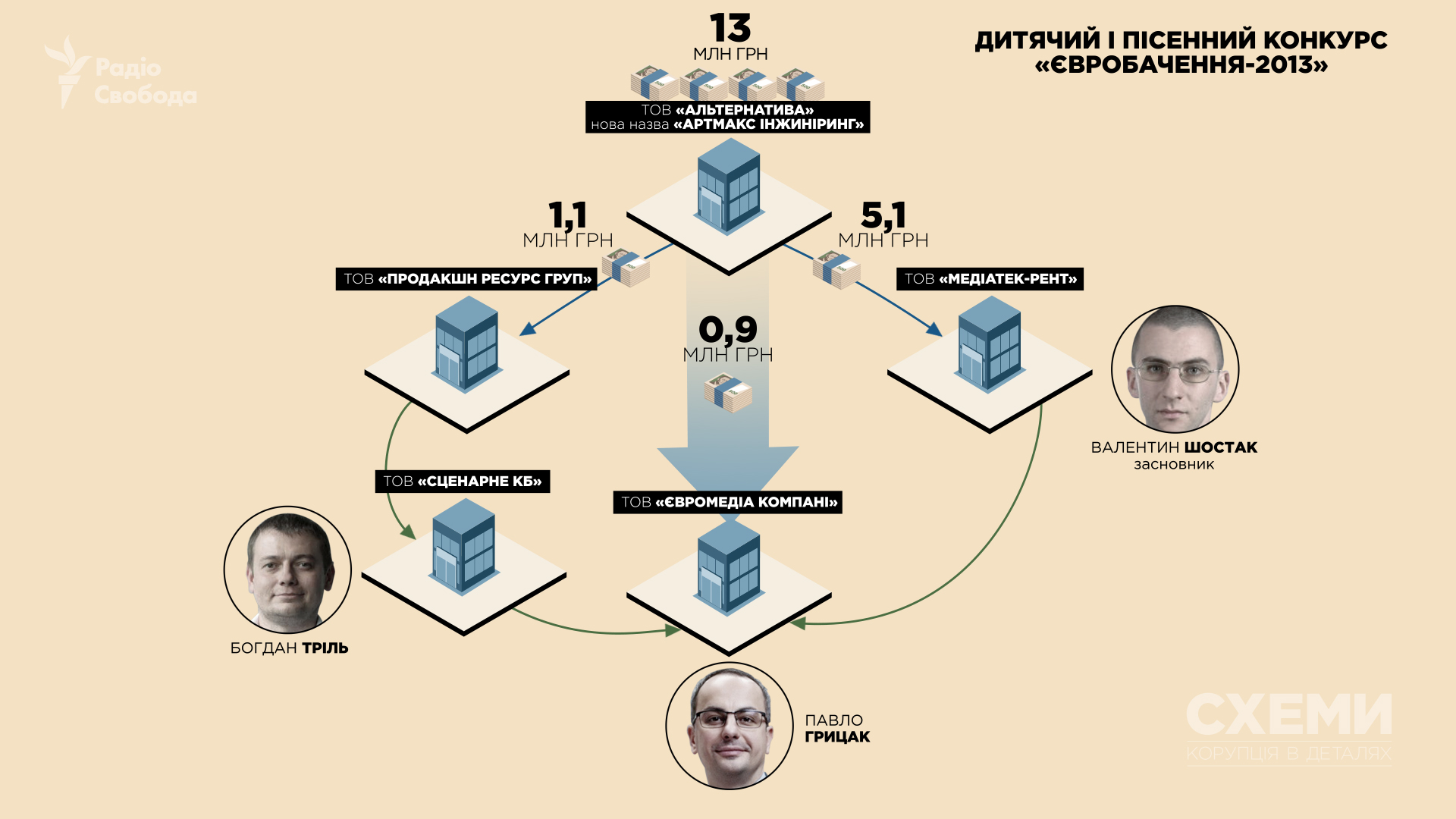 За інформацією із акту ревізії Державної інспекції України щодо фінансово-господарської діяльності НТКУ, ТОВ "Альтернатива" ("Артмакс Інжинірінг"), отримала 13 мільйонів гривень на тендерах дитячого "Євробачення", але частину коштів перерахувала фірмі Павла Грицака ТОВ "Євромедіа Компані" за субпідрядні роботи.