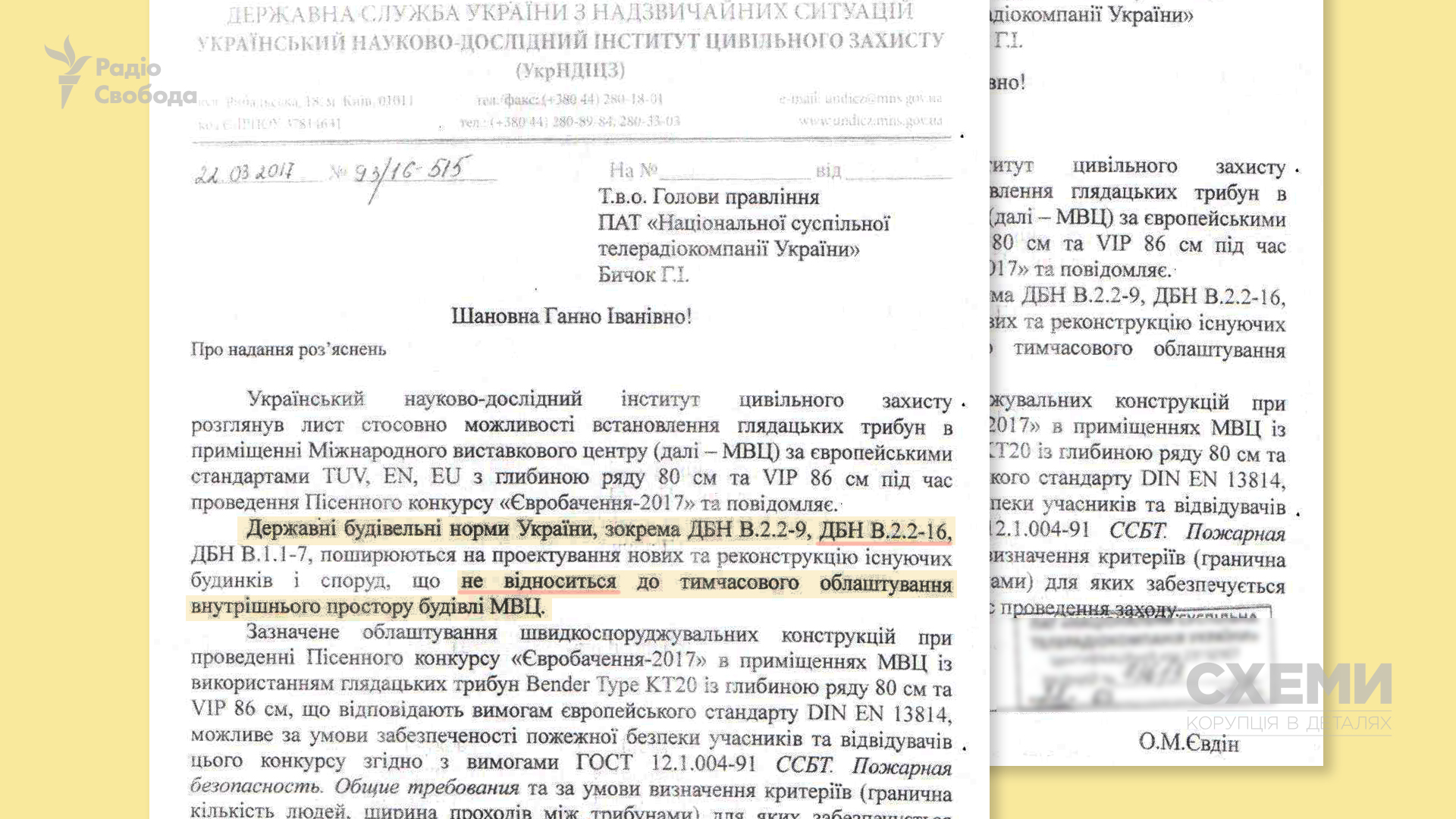 Водночас у розпорядженні програми "Схеми" є пояснення з цього приводу Українського науково-дослідного інституту цивільного захисту, в якому йдеться, що "ДБН В2.2.16 не відноситься до тимчасового облаштування внутрішнього простору будівлі МВЦ".