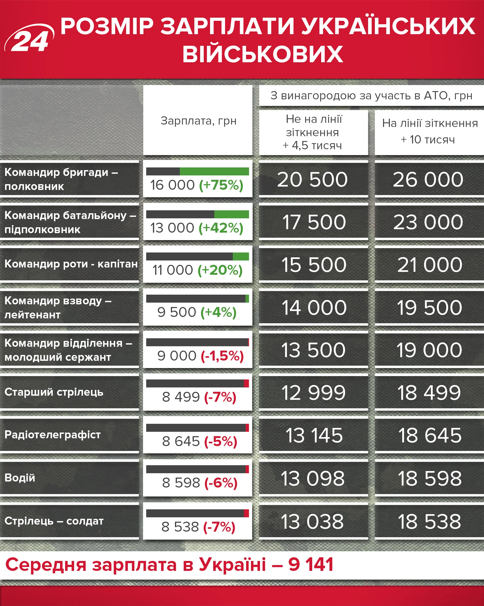 Журналісти 24 каналу підготували інфографіку, у якій порівняли нинішні зарплати військовослужбовців залежно від звання, посади та перебування в зоні ООС на лінії зіткнення або поза нею з середньою платнею в Україні.