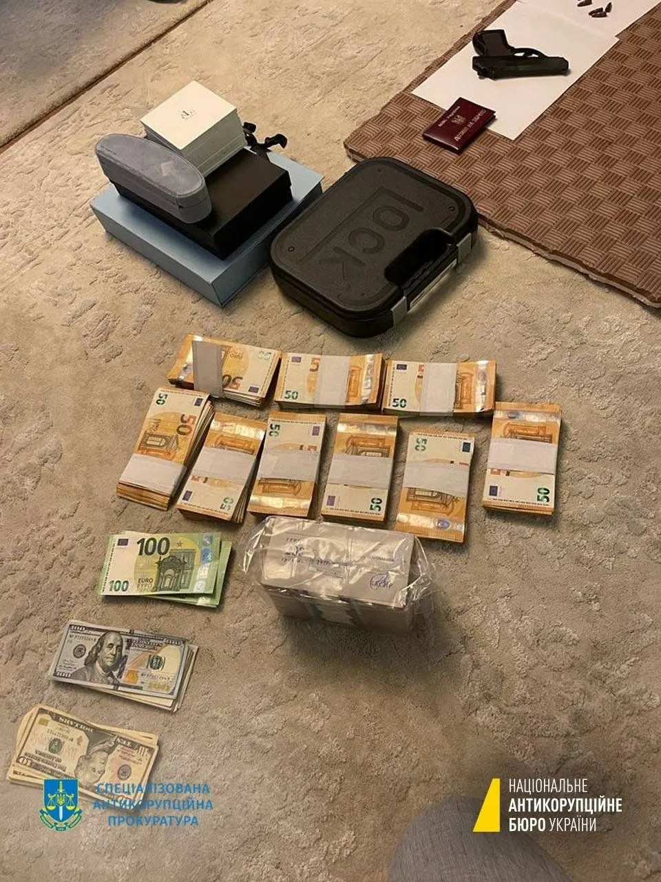 У НАБУ додали, що в охоронця знайшли готівку: 200 тисяч гривень, 49 тисяч євро, 11,5 тисячі доларів.