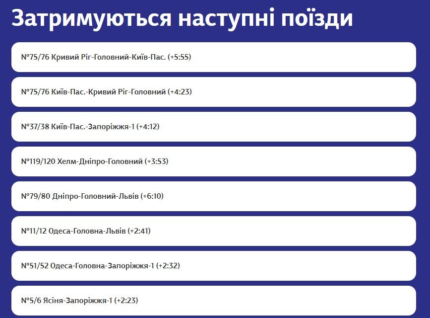 Станом на 08:37 залізничники вивели резервні тепловози, а енергетики поступово відновлювали рух електротягою. Попри це, затримуються потяги, що рухаються через Дніпропетровщину, зокрема: