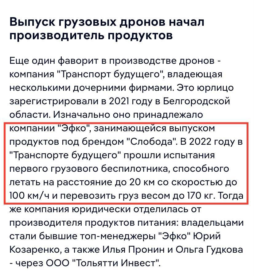 До речі, у 2023 році ЭФКО інвестували 40 мільярдів рублів у розвиток вантажних дронів. А бєлгородський виробник безпілотників ТОВ "Транспорт майбутнього" став одним із членів ради директорів ЭФКО. У вересні 2024 року він оголосив, що виходить з ЭФКО і збирається наростити виторг – понад 100 мільйонів рублів.