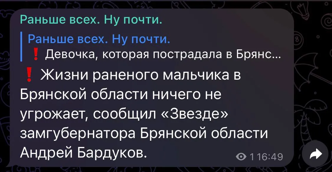 Повернімося до дівчинки з автобуса. Спочатку написали, що вона жива і її госпіталізували. Мовляв, дані про смерть неправдиві. Гаразд, але як тоді пояснити, що інші пабліки повідомляють уже про хлопчика, посилаючись на заступника губернатора Брянської області Андрія Бардукова? Вони і тут не можуть визначитися, кого уявні "диверсанти" обстріляли.