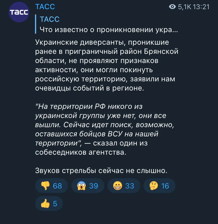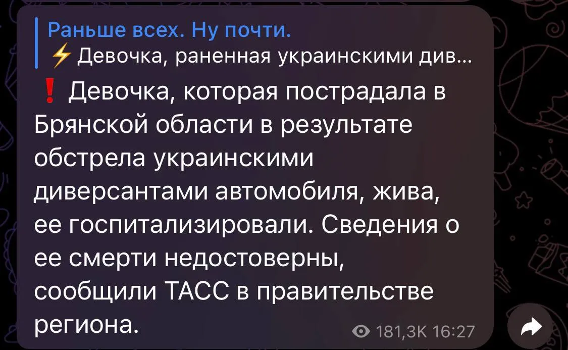 Один з телеграм-каналів стверджував, що обстріляли "диверсанти" буцімто шкільний автобус. І що це стало причиною гибелі УЖЕ двох людей, а також поранення дитини. Зауважимо, що про шкільний автобус написали також канали-мільйонники. В одному з пабліків зазначили навіть, що у Брянській області було бойове зіткнення з тими самими "українськими диверсантами".