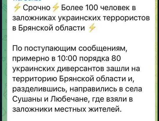 Мало вам розстріляних і воскреслих школярок? Тоді заглянемо в інший паблік. Там розносять інформацію про те, що понад 100 людей "українські терористи" взяли у заручники у Брянській області. Мовляв, близько 10:00 2 березня орієнтовно 80 "диверсантів" зайшли на територію області. Вони, увага, розділилися та розбіглися по селах Сушани та Любечанка.