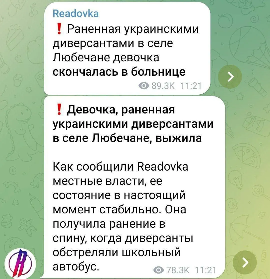 На цьому ми могли б завершувати, але ж у телеграм-каналах продовжує нестися. Власне, в одному з них об 11:21 повідомили, що дівчинка, яку буцімто поранили в автобусі, померла в лікарні. У ту ж хвилину надійшло інше повідомлення – адміністратори не змогли синхронізуватися – про те, що дівчинка "вижила". Мовляв, її стан стабільний. Школярці поцілили у спину, коли той самий автобус буцімто обстріляли "диверсанти".