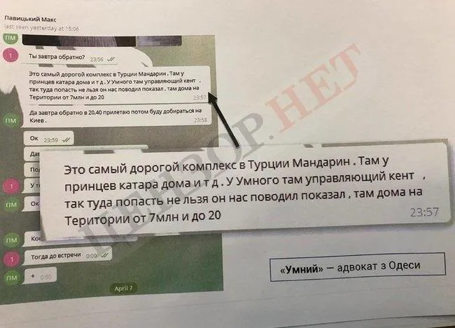Одну з них згодом планували здавати в оренду. Допомагає з купівлею одеський бізнесмен Віталій Астахов, передавав готівку частинами в руки турецькому ріелтору. У тому ж месенджері Продан домовлявся і про хабарі.