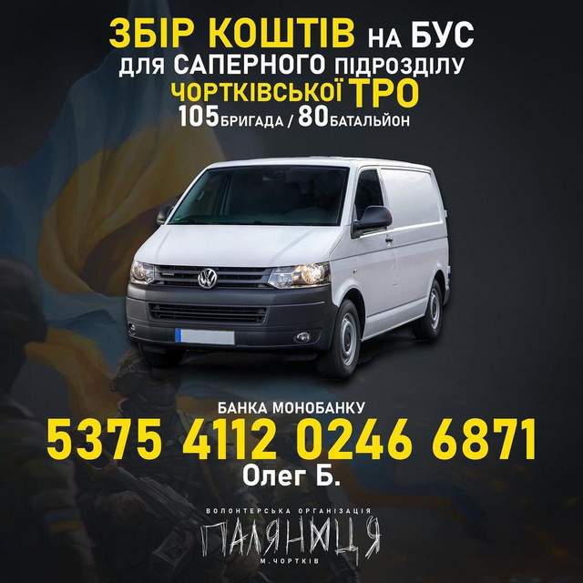 Ми повинні сприяти нашій перемозі, а це можна робити, збираючи кошти на транспорт, якого потребують військові. Так, волонтерська організація "Паляниця" відкрила збір коштів на бус для саперів чортківської ТРО, й закликає долучатися.