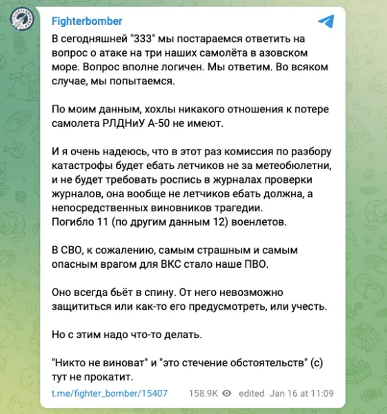 Про це повідомляє провоєнний російський телеграм-канал Fighterbomber. Автор стверджує, що літаки, які впали (крім А-50, упав ще й Іл-22), нібито опинилися під вогнем російської ППО.