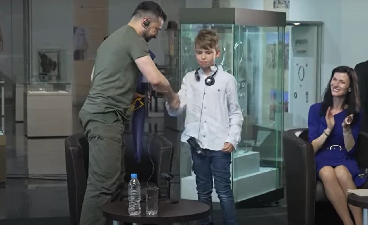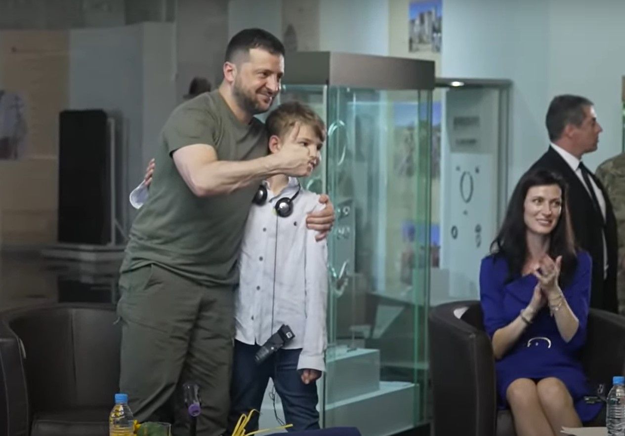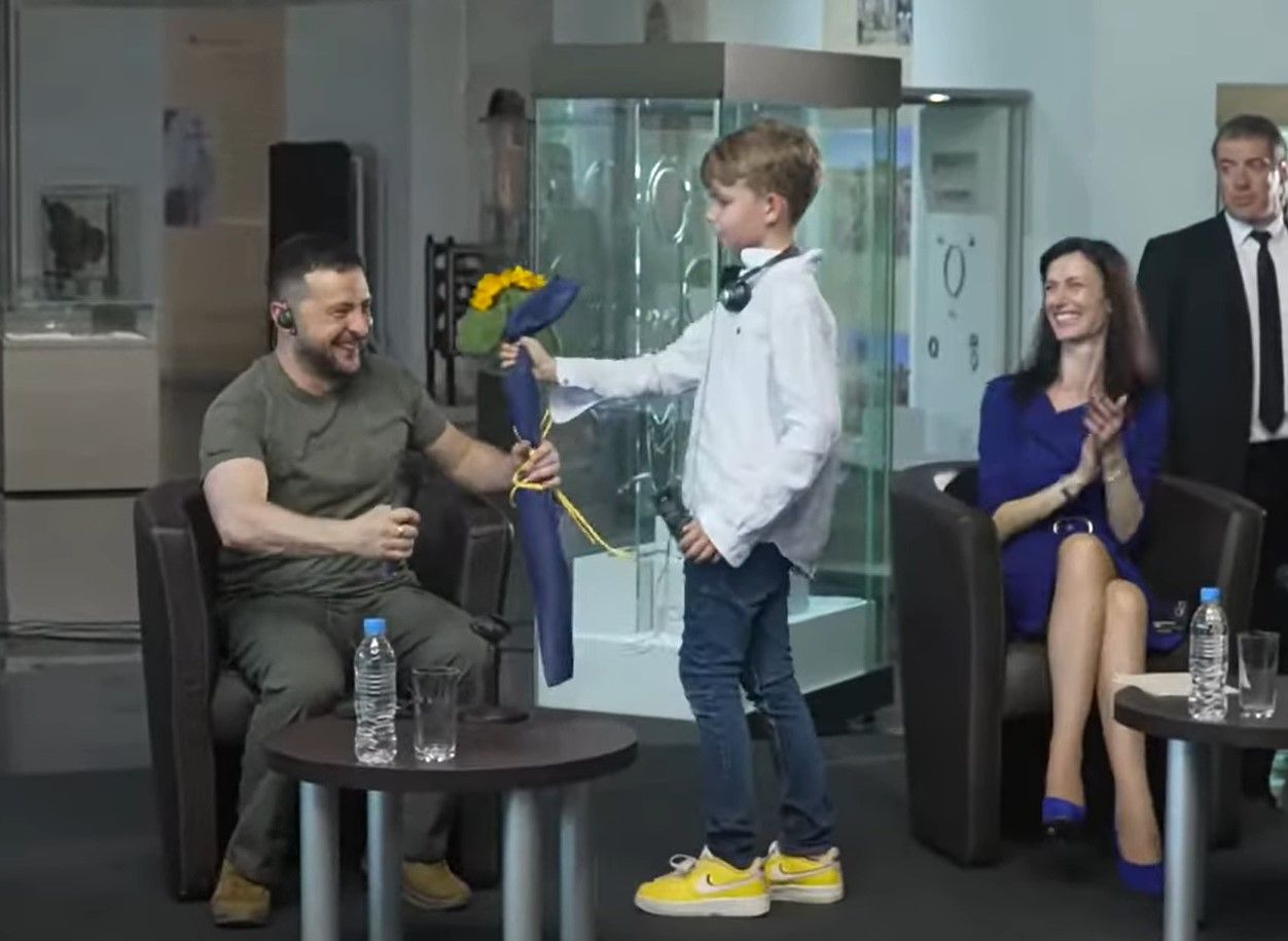 Хлопчик сором'язливо підійшов до Зеленського і вручив йому букет. Після рукостискання з президентом хлопчик викрикнув "Слава Україні". Щоправда, за підказкою залу. Після цього дитина заусміхалася та почала позувати для фото з главою держави.