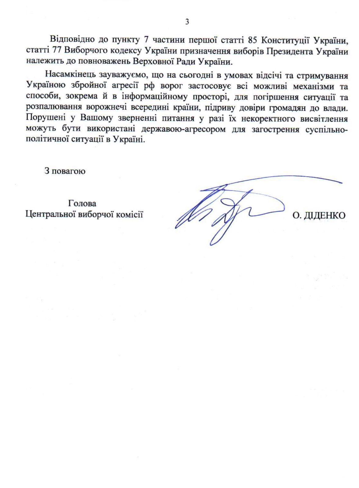Центрвиборчком вказує на закладену у Конституції безперервність здійснення влади, виконання президентом повноважень до вступу на посаду його наступника та відсутність підстав говорити про можливу передачу президентських функцій до голови Верховної Ради. Зокрема ЦВК посилається на статті 106 і 108 Конституції України. І наголошує, що тему "20 травня" може використовувати ворог для розпалювання ворожнечі та підриву довіри до влади всередині країни.