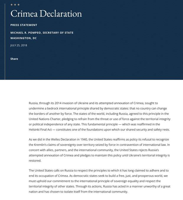 Дуже цікаво, що ця заява Держдепу вийшла через десять днів після зустрічі Трампа та Путіна у 2018 році. Перед зустріччю Трамп допускав висловлювання, які свідчили про можливість перегляду в майбутньому політики США щодо невизнання спроби анексії Криму.