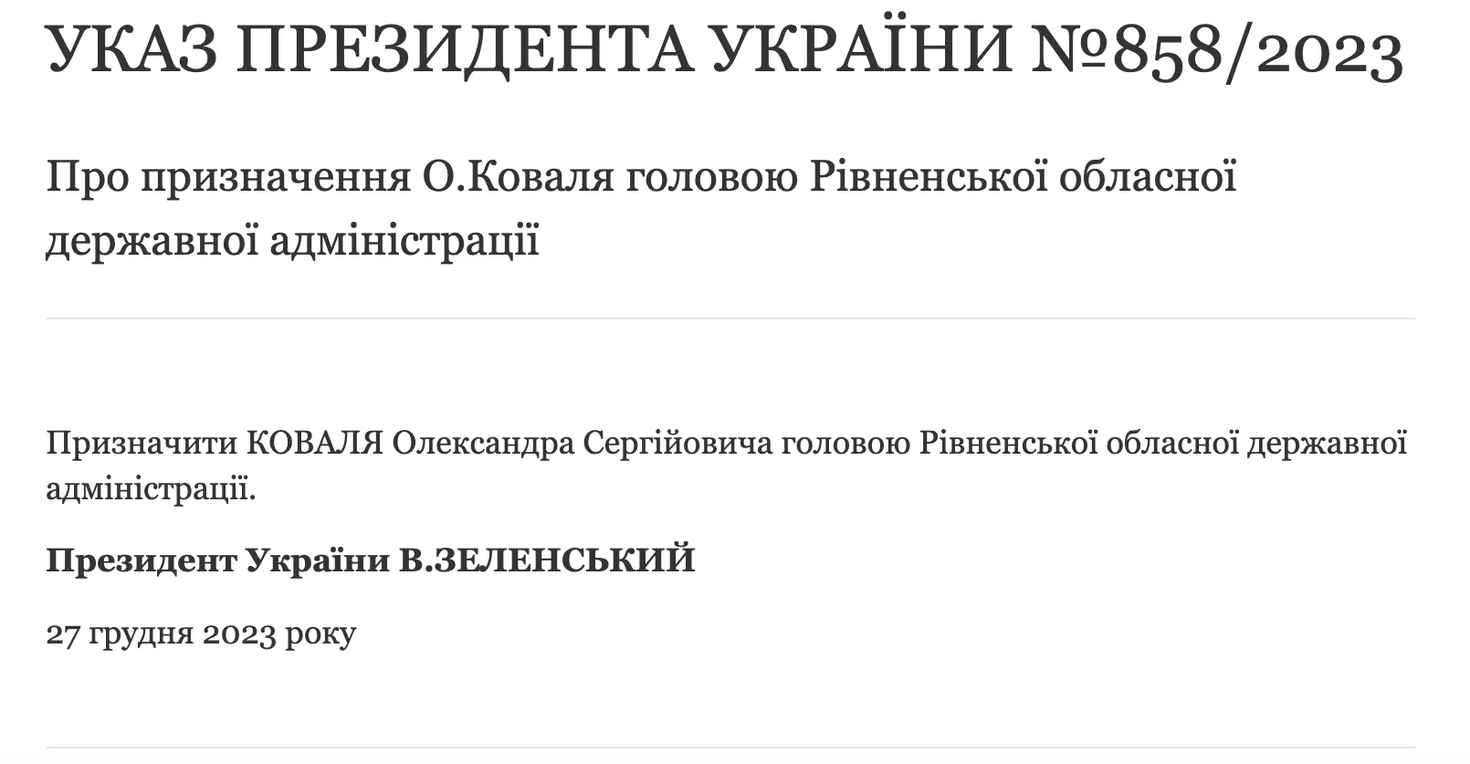 Відповідно до указу президента новим очільником Рівненської обласної військової адміністрації стане Олександр Коваль. Відомо, що чоловікові 36 років і з 2021 року він очолював Рівненську районну державну адміністрацію.