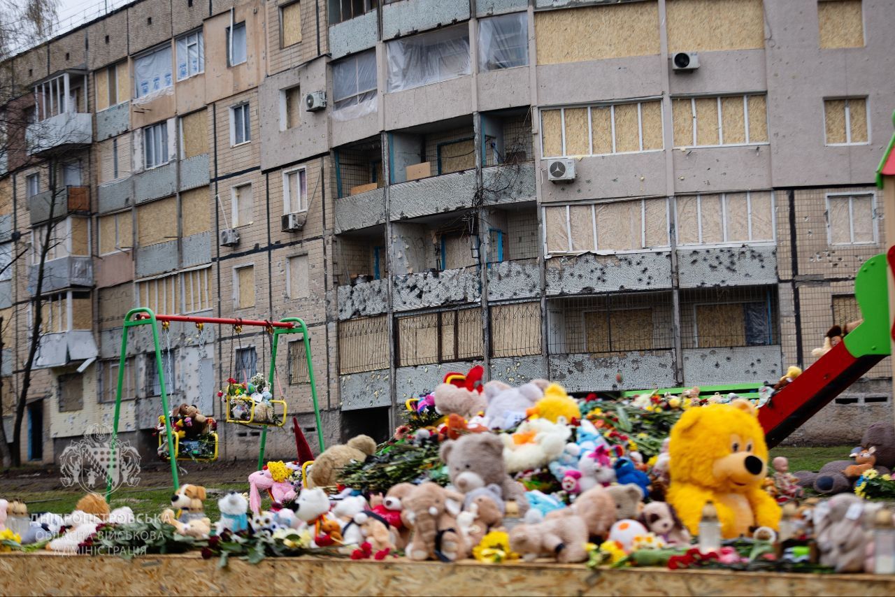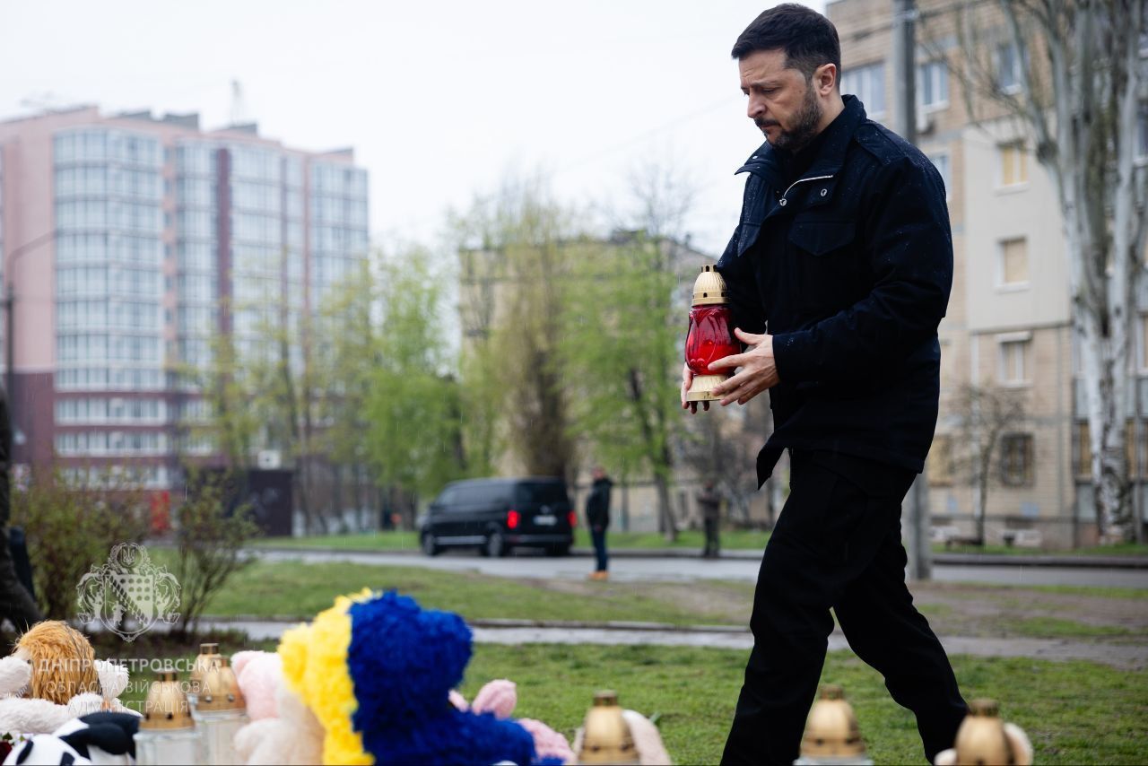 Український президент спільно з керівником ОВА Сергієм Лисаком приїхали на місце ракетної атаки та в пам'ять про загиблих запалили лампадки та принесли іграшки. Разом вони оглянули обсяги пошкоджень на місці удару.