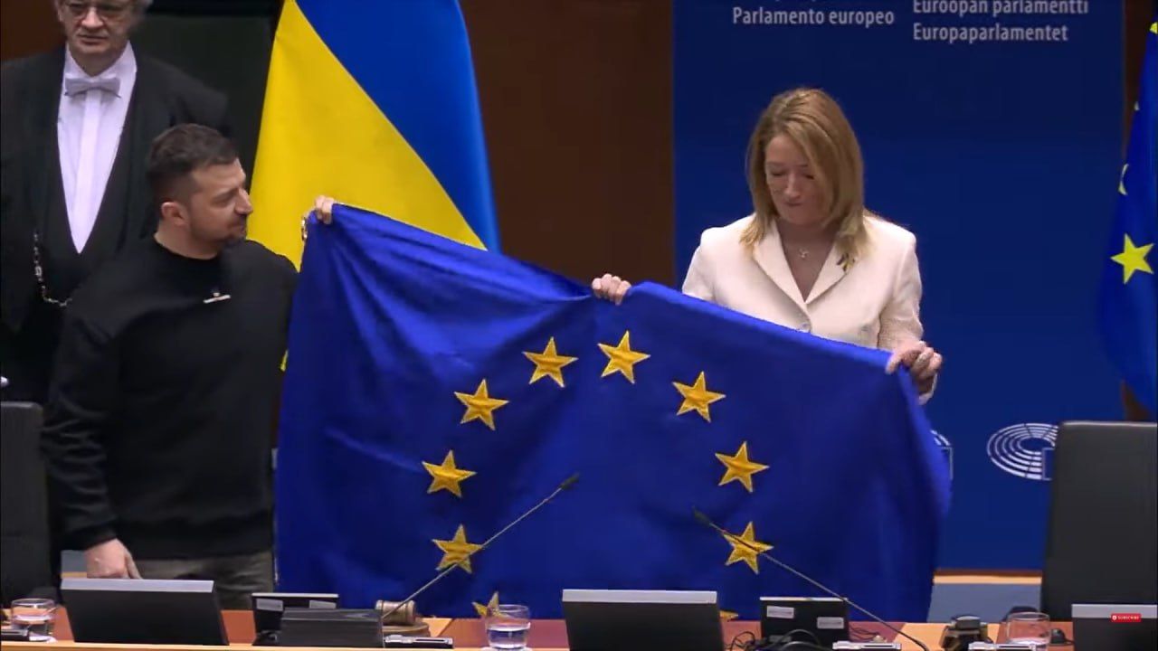 - Зеленський разом з головою ЄП Робертою Мецолою прослухали гімн України та гімн Євросоюзу. Вони звучали перед промовою нашого президента в Європарламенті.