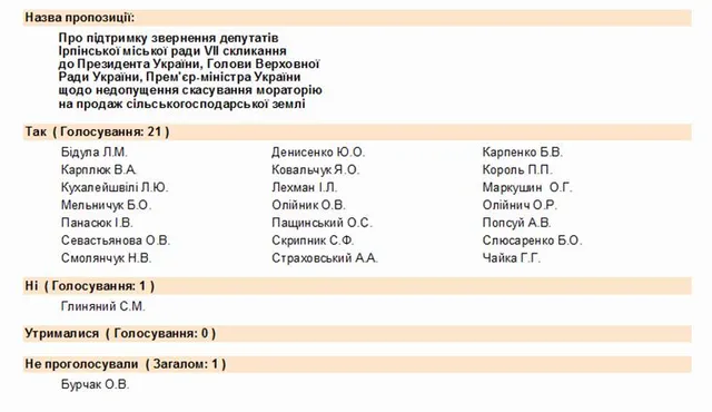 3. Концепція опозиції (яку і підтримали ірпінські депутати), що хоч і постулює збереження мораторію, однак у перспективі 5-ти -10-ти років все ж ратує за відкриття ринку землі, де єдиним покупцем буде держава, проте, дана ідея все-одно не передбачає головного – реалізації громадянами свого конституційного права на купівлю та вільне володіння землею.