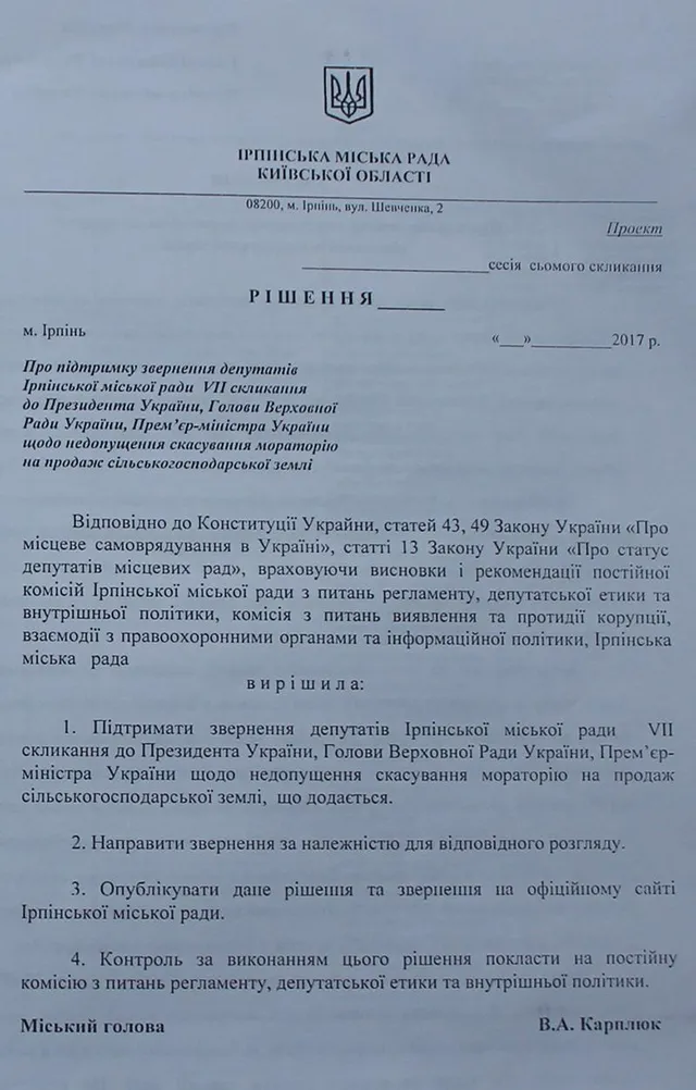 Противники скасування земельного мораторію, у тім числі й більшість ірпінських депутатів, аргументують свої позиції піклуванням про сільське господарство.