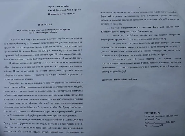 Якщо ж за підрахунками дослідників відкриття ринку землі для України як держави та її громадян є вигідним, то чому ж депутати Ірпіньради виступають проти цього? Для того щоб розібратись у даному питанні пропоную детальніше розглянути аргументи ірпінських обранців громади, викладені у їхньому зверненні до вищого керівництва держави.